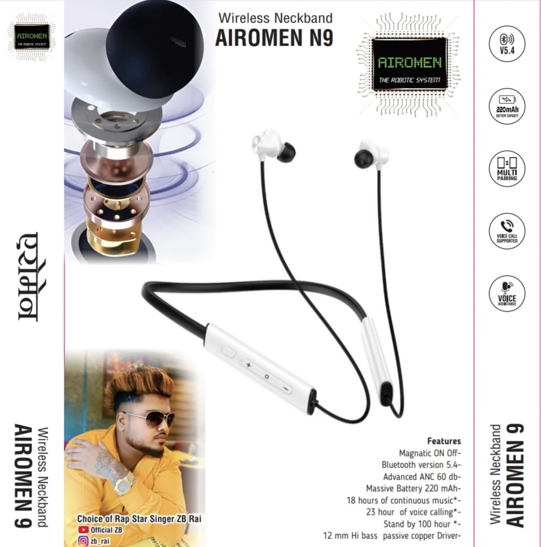 Airomen Bluetooth Neckband N9 designed with strong bass and crystal clear sound technology for music lover youth. It have 12 mm high bass passive Driver with Balanced treble, 18 hours of music play, special button for google and siri Assistant, magnatic on off, 220 mah battery for log talk time and music, smooth and silk design with strong wire and smart AI ic chip and many more features.